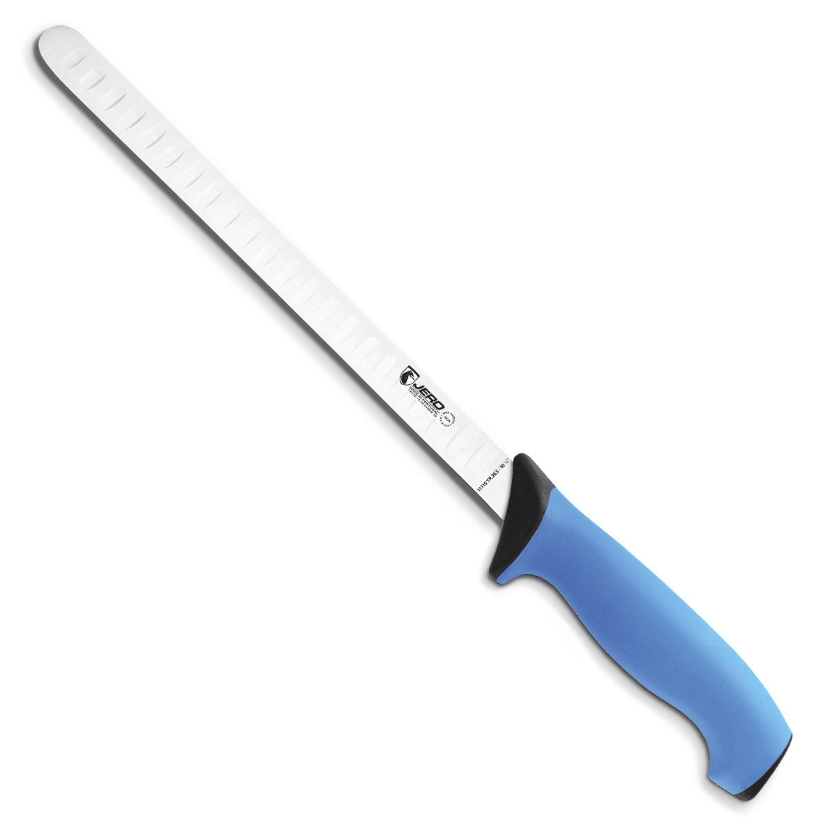 Нож для хамона – специальный ножи для нарезки хамона, так же удобен для разделки / нарезки лосося и другой крупной рыбы. Благодаря наличию “воздушных карманов” на клинке, к ножу не прилипают продукты.